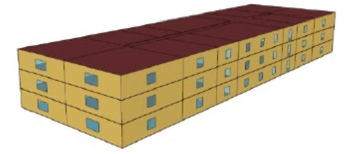 The medium office building model is a three-story rectangular building with an overall area of 53,600 square feet. It has a window-to-wall ratio of 33 percent with fenestration distributed evenly across all four façades. The zones are served by DX cooling and gas furnace heating with hot water reheat. For more details refer Appendix 3A. This prototype is used for both detailed geometry and simple geometry test cases.